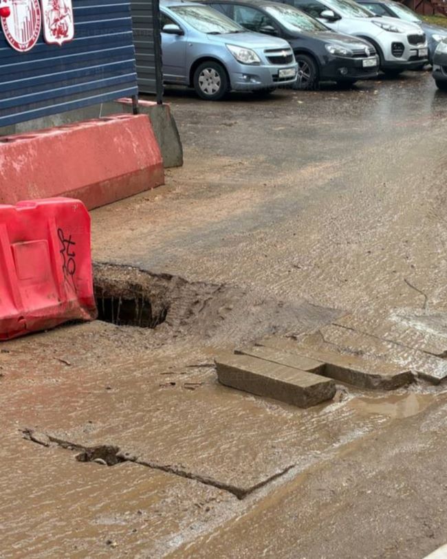 Кроме самой дыры, просел асфальт по всей ширине дороги. Это последствие строительства сквозного проезда между Московским и Центральным проспектами.