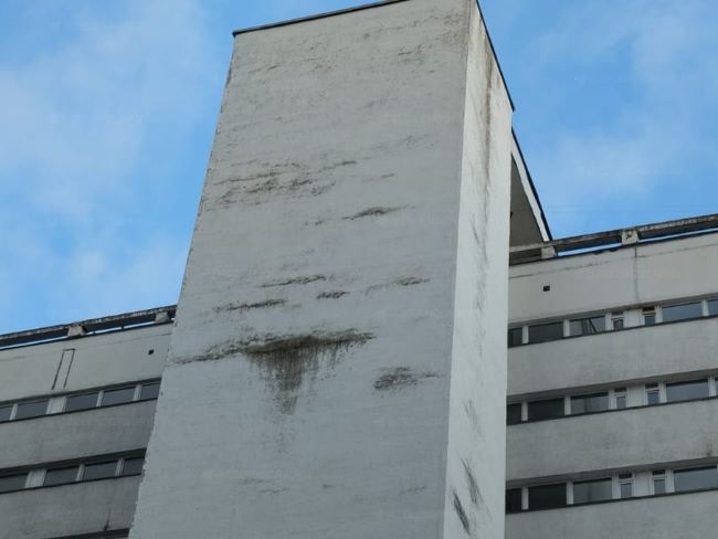 Жители же считают, что на стенах не просто темные пятна, а плесень. И это вполне вероятно: через отваливающиеся утеплитель и штукатурку много лет проходит влага, впитывается в стены — вот и среда для грибка и плесени. В этом случае покраской поверх безобразия не поможешь: нужно полностью очищать стены, обрабатывать антисептиком, заделывать межпанельные швы и качественно штукатурить и красить.