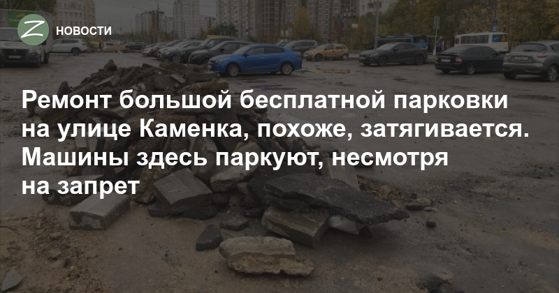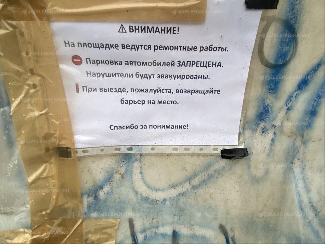 На въезде на парковку установлен барьер с объявлением о запрете стоянки из-за ремонта и угрозой эвакуации. Но водители предупреждение, похоже, не заметили — многие места заняты автомобилями. Надпись на заграждении мелкая и с расстояния плохо различима. Парковка вдоль улицы теперь платная и альтернативы будет пользоваться повышенным спросом.