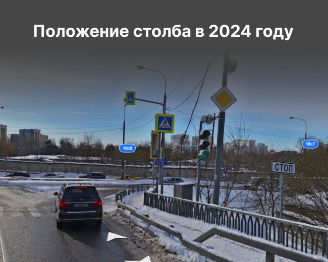 Почему столб поставили на тротуаре — непонятно. На панорамах прошлых лет, начиная с 2018 года, видно, что аналогичный столб стоял за ограждением, не мешая пешеходам.