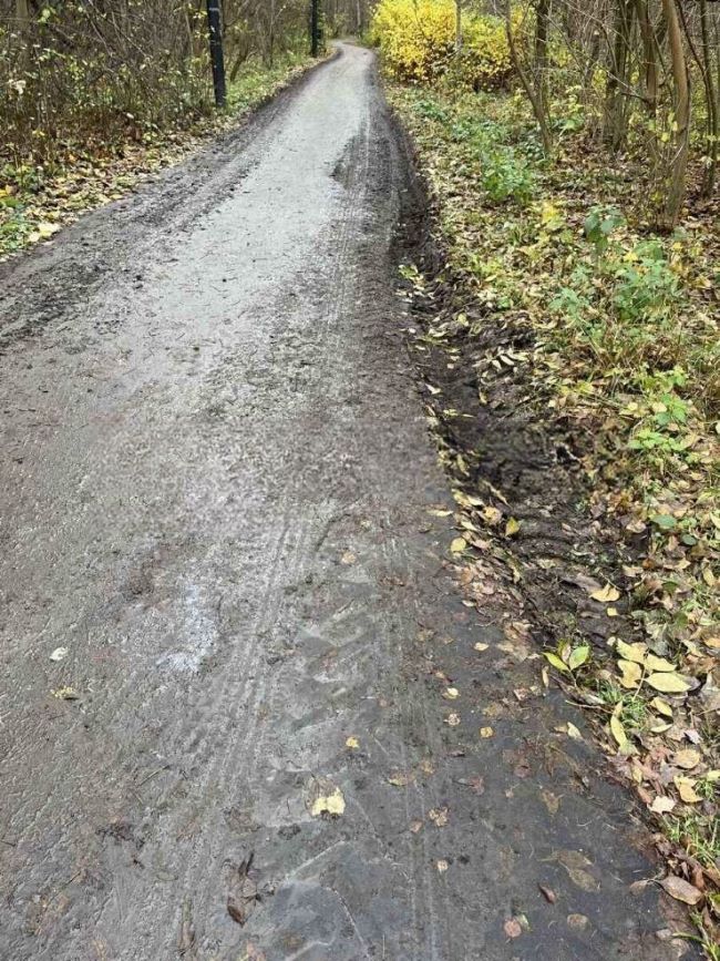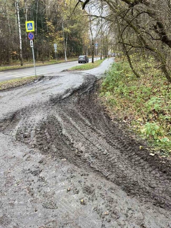 Чистка леса от старых деревьев и листвы сопровождается, как всегда, «побочными эффектами» — техника не помещается на дорожках и не вписывается в повороты, оставляя грязь и колеи на обочинах.