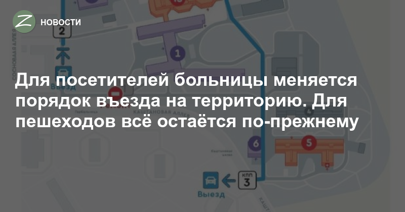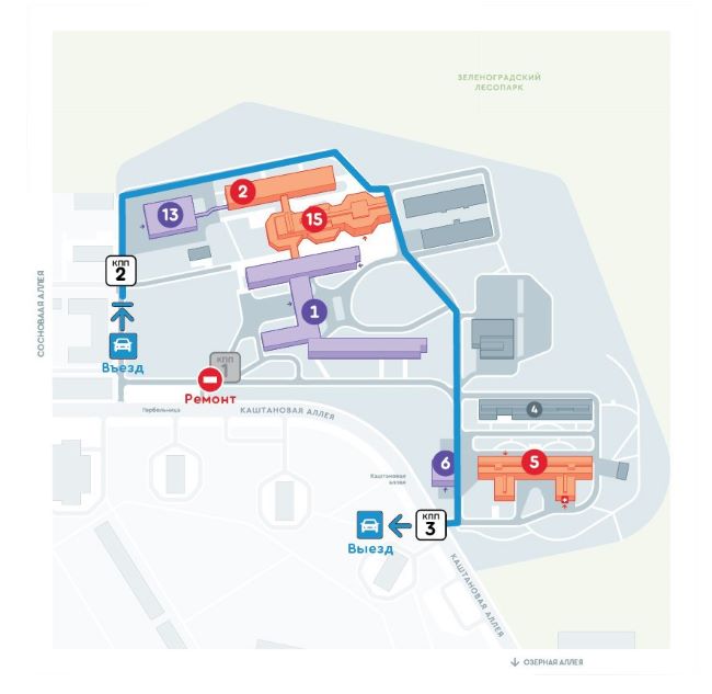 С 25 октября въезд машин на территорию клиники будет круглосуточно осуществляться только через КПП №2. Выехать из больницы можно будет только через КПП № 3 — ворота у Женской консультации — ключевые изменения на схеме.