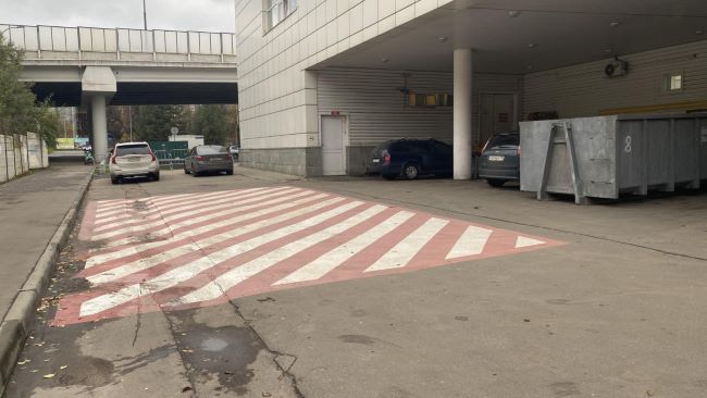 Сейчас рядом с пешеходным переходом возле въезда и выезда на парковку появился красный пластиковый блок — возможно, для ограничения движения автомобилей. Но он почти никак не мешает пользоваться нелегальным выездом.