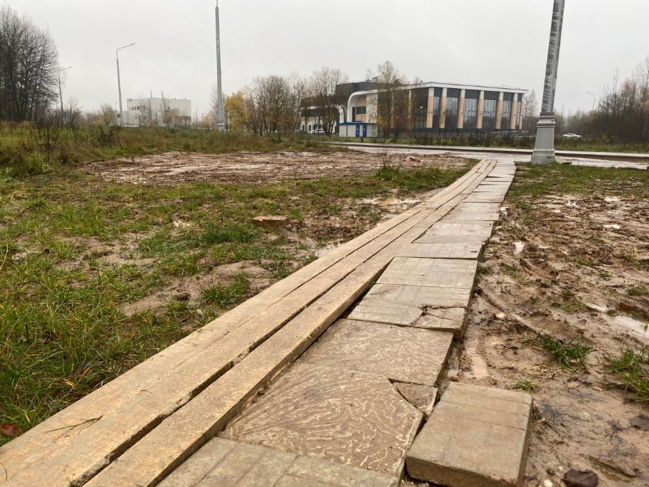 Улучшенная версия — на фото. Несмотря на уложенные настилы, проход по-прежнему остается неудобным. Вокруг грязь и лужи, а деревянные дощечки, положенные «поверх» проблемы, быстро намокают и местами проваливаются.