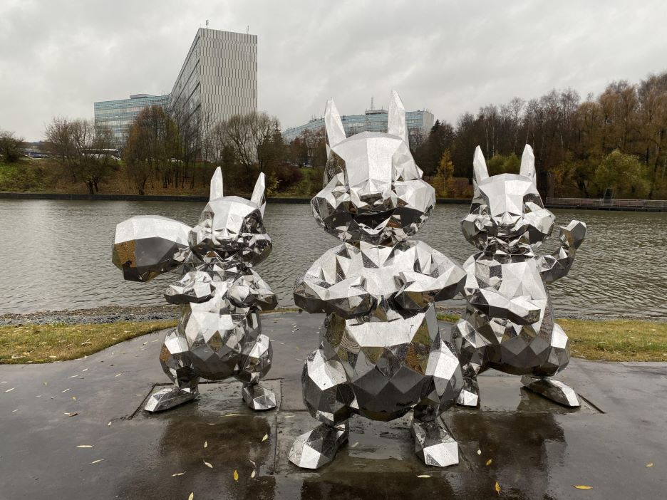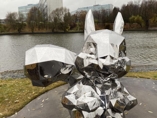 Полигональные скульптуры выполнены из нержавеющей стали с зеркальной полировкой — материал не подвержен коррозии и выдерживает механические воздействия, а сама конструкция имеет внутренний каркас и прочно закреплена на бетонном основании, что должно делать её антивандальной.