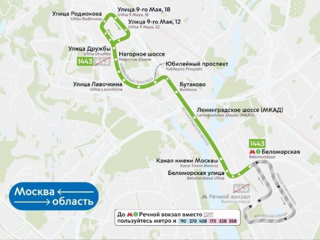 Вместо него со 2 ноября ходит московский маршрут 1443, но от метро «Беломорская». Это очередной маршрут переданный московскому перевозчику от областного перевозчика. Новым маршрутам добавляют «1» в начало номера, чтобы сохранить привычный номер. Но схема движения не всегда остаётся идентичной.
