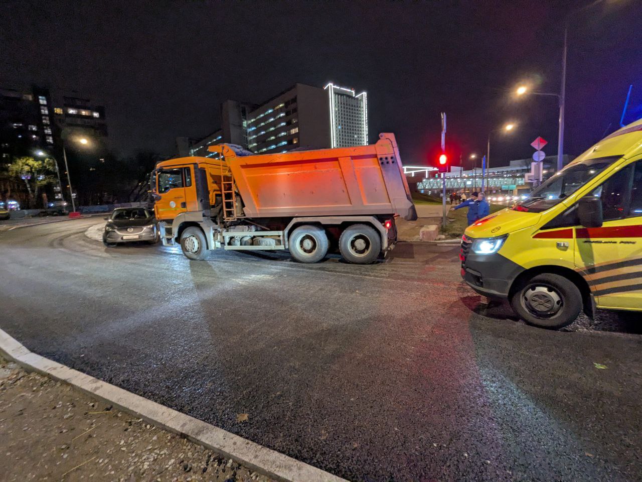 В этом месте спешно укладывают новый асфальт — грузовик как раз вёз его для дорожных работ. Разметку здесь нанести ещё не успели.