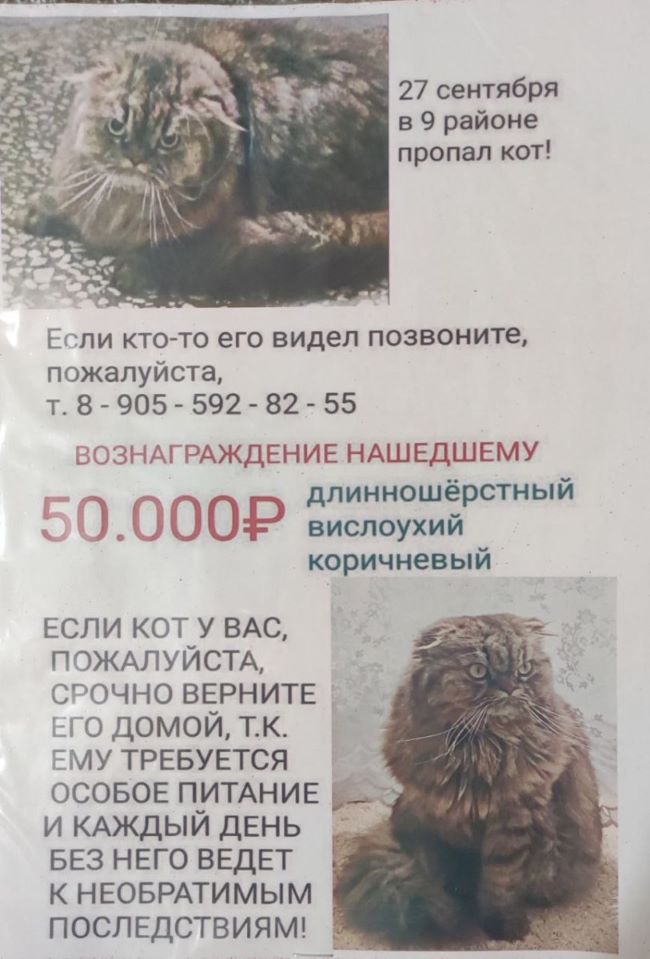 «У всей семьи стресс, но что делать — начали искать. Клеили листовки, просили „Жилищник“ — они открыли подвалы, мы обошли все, но безрезультатно. Решили, что, может, кто-то его забрал — кот у нас красивый. Повесили объявления с вознаграждением, сначала 15 000 ?, потом 50 000 ?, звонили и хорошие люди, и мошенники. Прошел почти месяц».