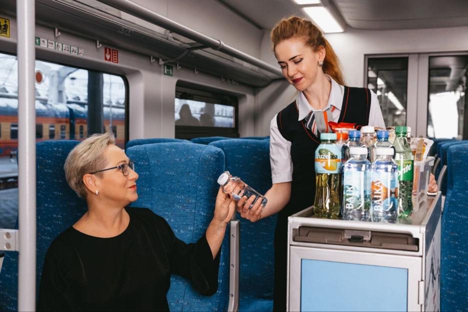 В «Ласточках-экспрессах», следующих намного быстрее «комфортов», еду уже продают — развозят по вагонам на тележке. Можно купить кофе, чай, булочку, шоколад, чипсы и тому подобное. Цены, разумеется, выше магазинных.