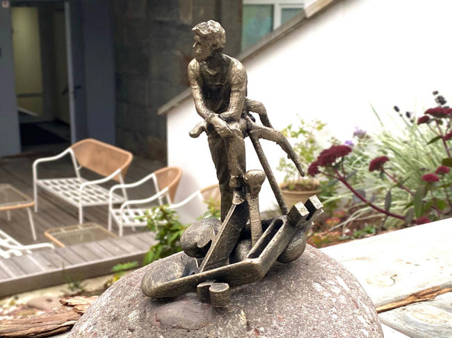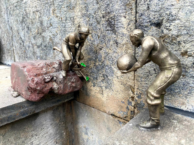 Фигурки спрятаны в самых неожиданных местах: на подоконниках, в клумбах, среди архитектурных деталей. Одни везут ноты на крошечных тележках, другие будто передают их друг другу или даже «спорят» за них. Есть и девушка, укрывшаяся рядом с металлической решёткой, напоминающей знак диез — в музыке он означает повышение ноты на полтона.