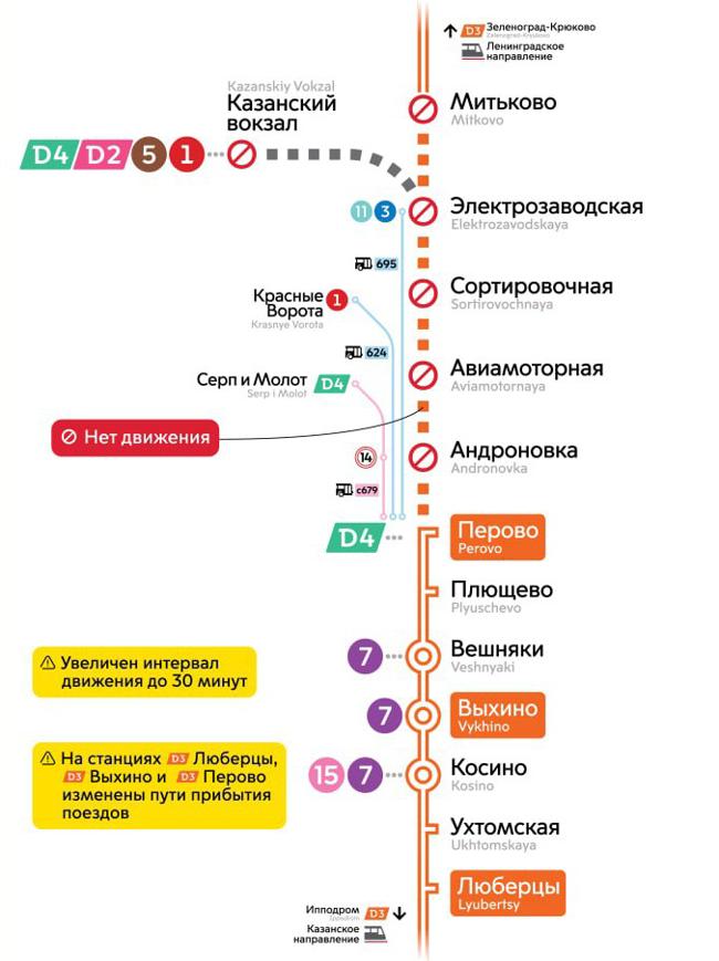 С 14:30 до 19:30 не будет движения между Митьково и Перово на Казанском участке D3 .