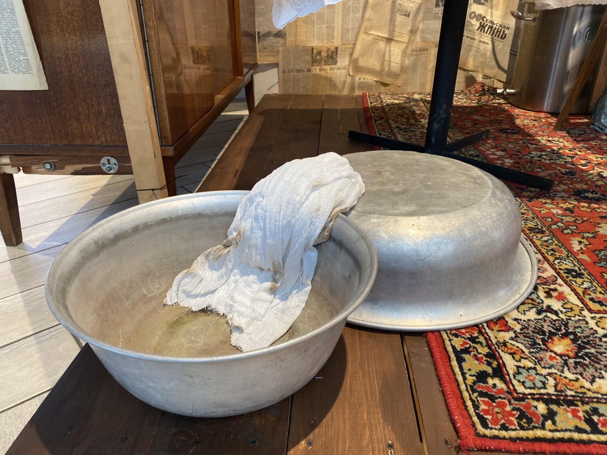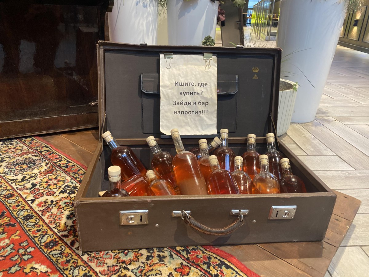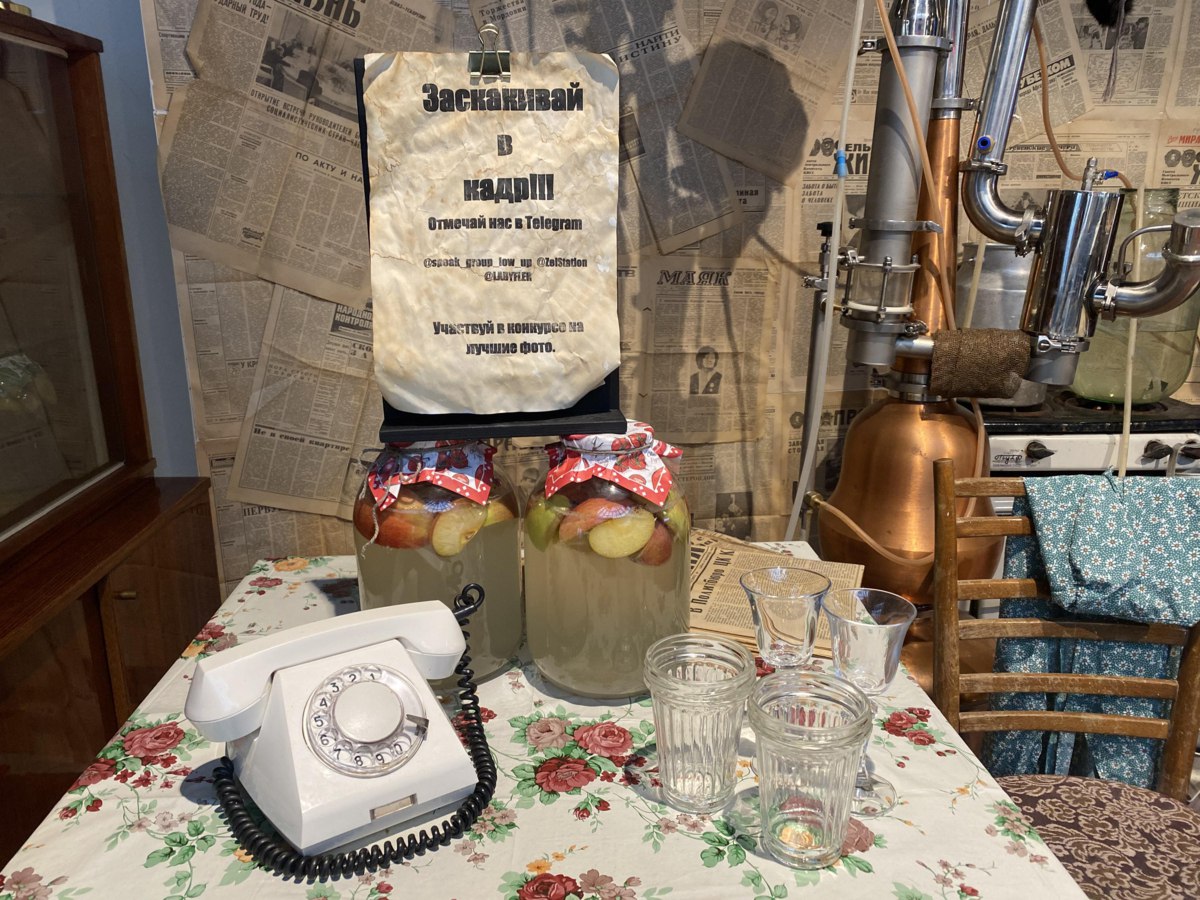 В интерьере — старые газеты, красный ковер, дисковый телефон, закатки с компотом, шапка-ушанка и другие атрибуты того времени. Отдельные тематические элементы — самогонный аппарат и чемодан с бутылками и приглашением в «бар напротив».