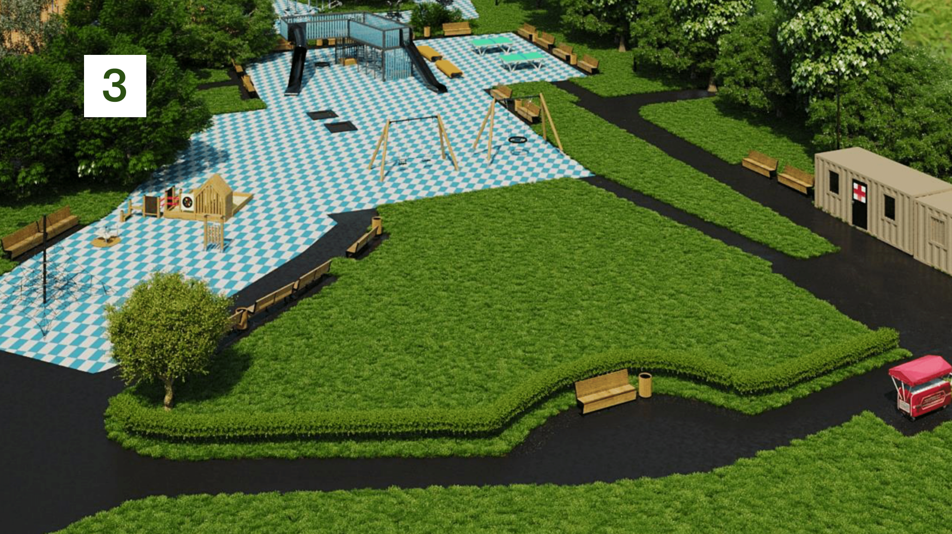 3. Детская зона: игровые площадки для старшего возраста и малышей, среди игровых элементов — батуты
