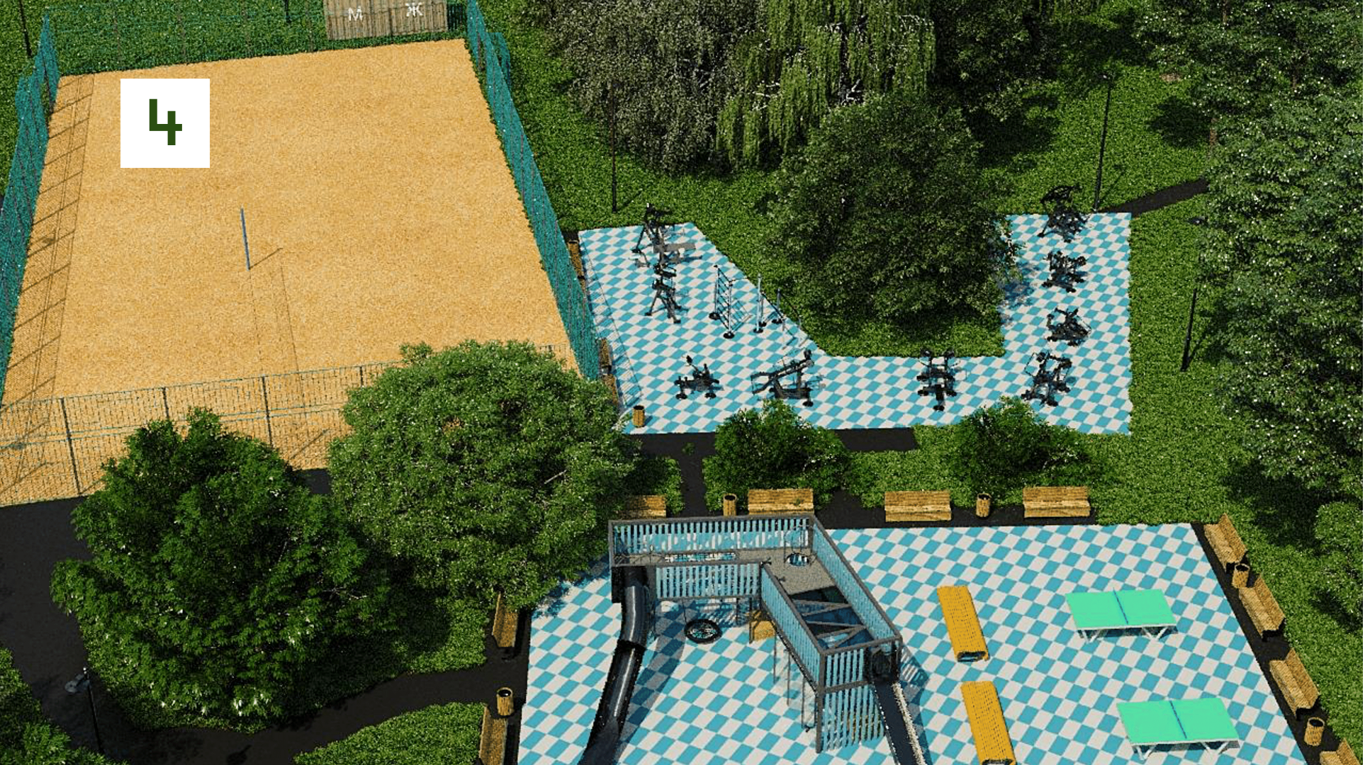 4. Спортивный кластер: площадка для командных игр с песчаным покрытием, теннисные столы и уличные тренажёры.