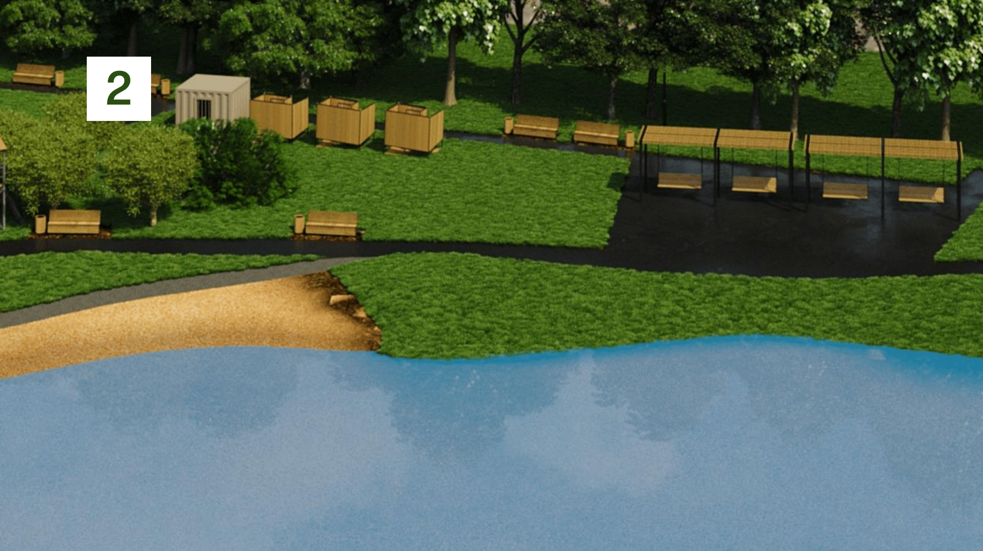 2. Прибрежная линия: открытый вид на озеро, каменная дорожка между песком и травой, парковые качели вдоль берега.