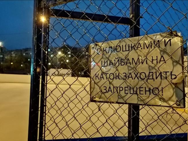 Хоккеистам (с клюшками и шайбой) вход запрещен — каток предназначен только для массового катания. Пока поиграть в хоккей негде — катки без искусственного льда начнут заливать, когда установится морозная погода, а по прогнозу этого пока не ожидается.