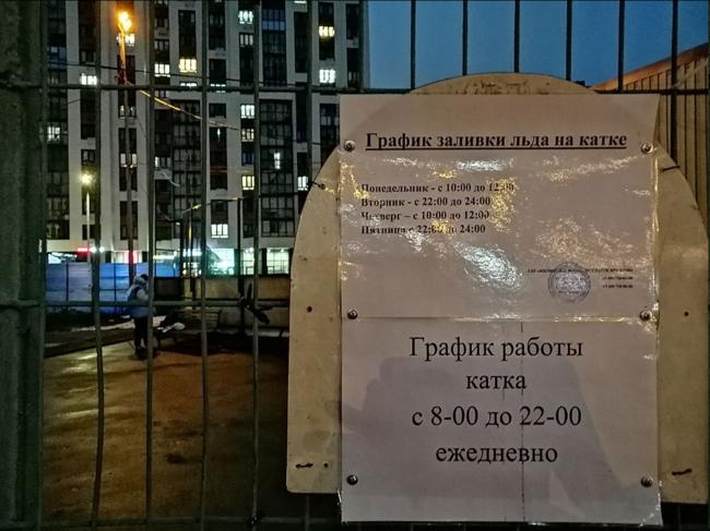 Заявлены перерывы на заливку льда по расписанию: понедельник 10:00—12:00, вторник 22:00—24:00, четверг 10:00—12:00, пятница 22:00—24:00 (как правило, лёд заливают дополнительно, по потребности). За порядком на на катке следит сотрудник «Жилищника».