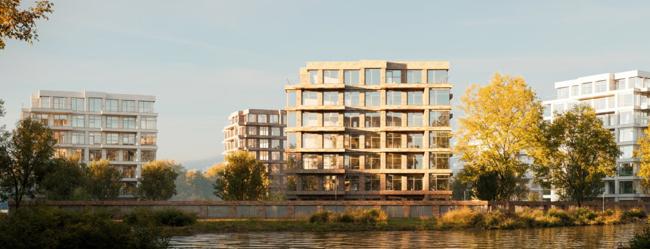 На опубликованных картинках несколько кварталов разной этажности. Центральную часть занимают корпуса до 15-18 этажей с современной кирпичной архитектурой и крупным остеклением, а у воды расположены 6-8-этажные дома с широкими балконами и панорамными видами.