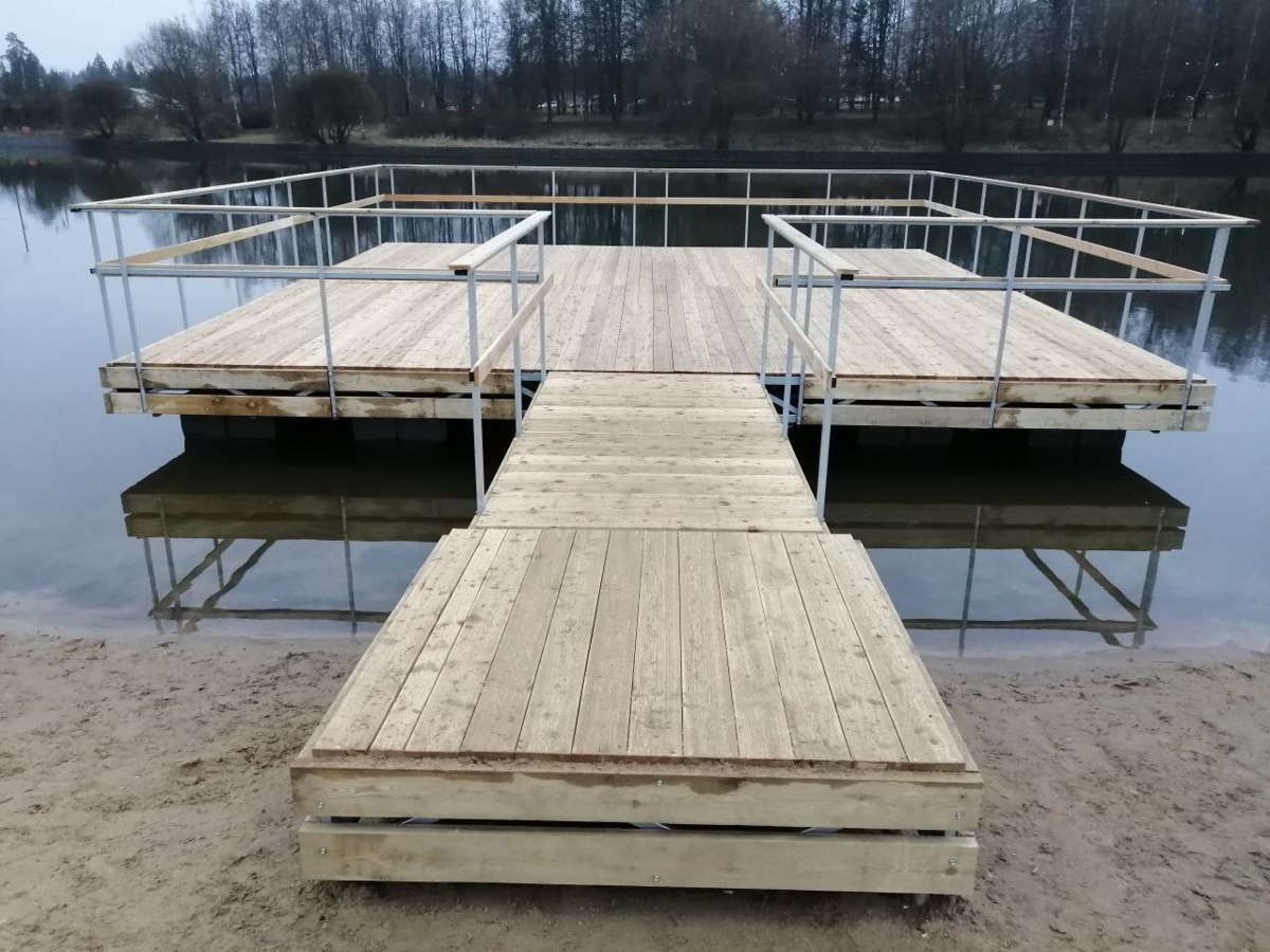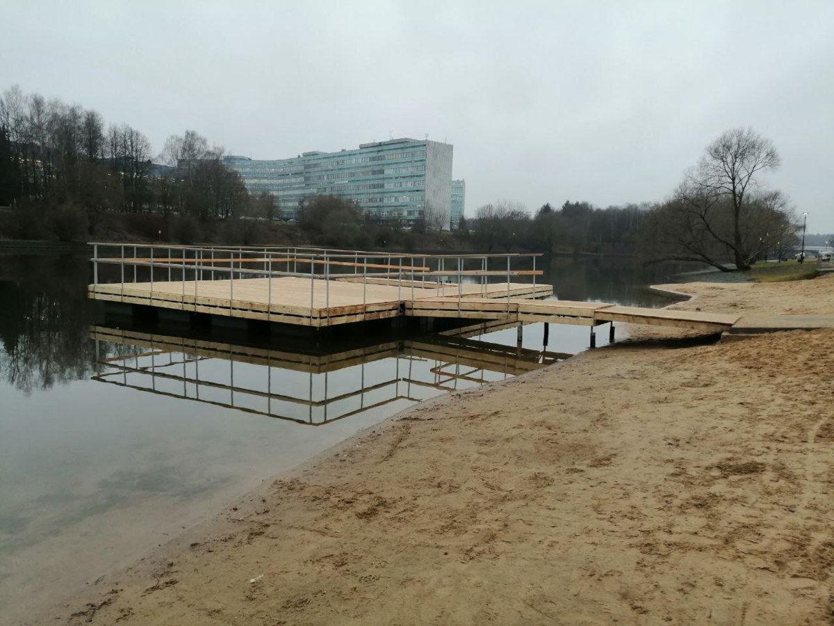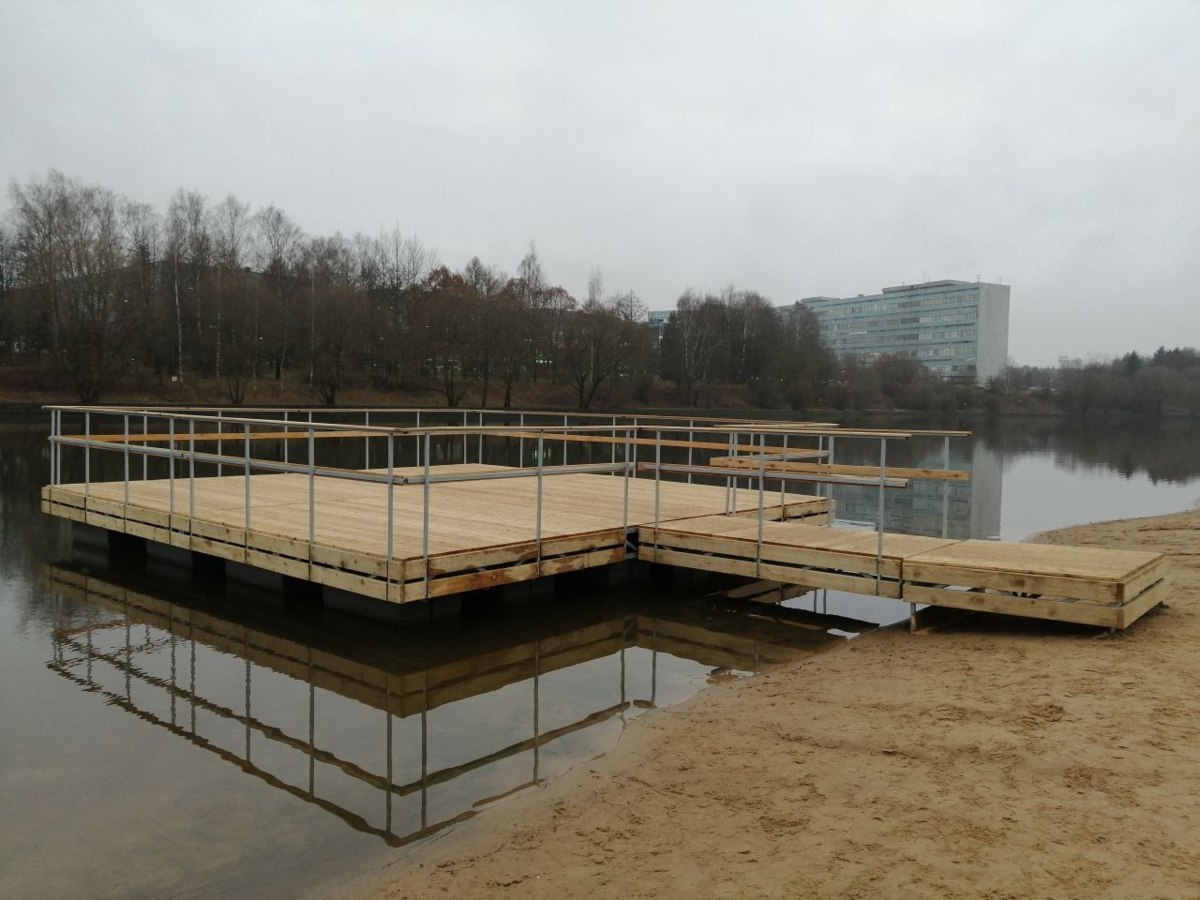 Второй на месте старого — перед спасательной вышкой, у него с входом всё нормально. Кроме основной площадки у него есть причал для лодок со скобами для швартовки.