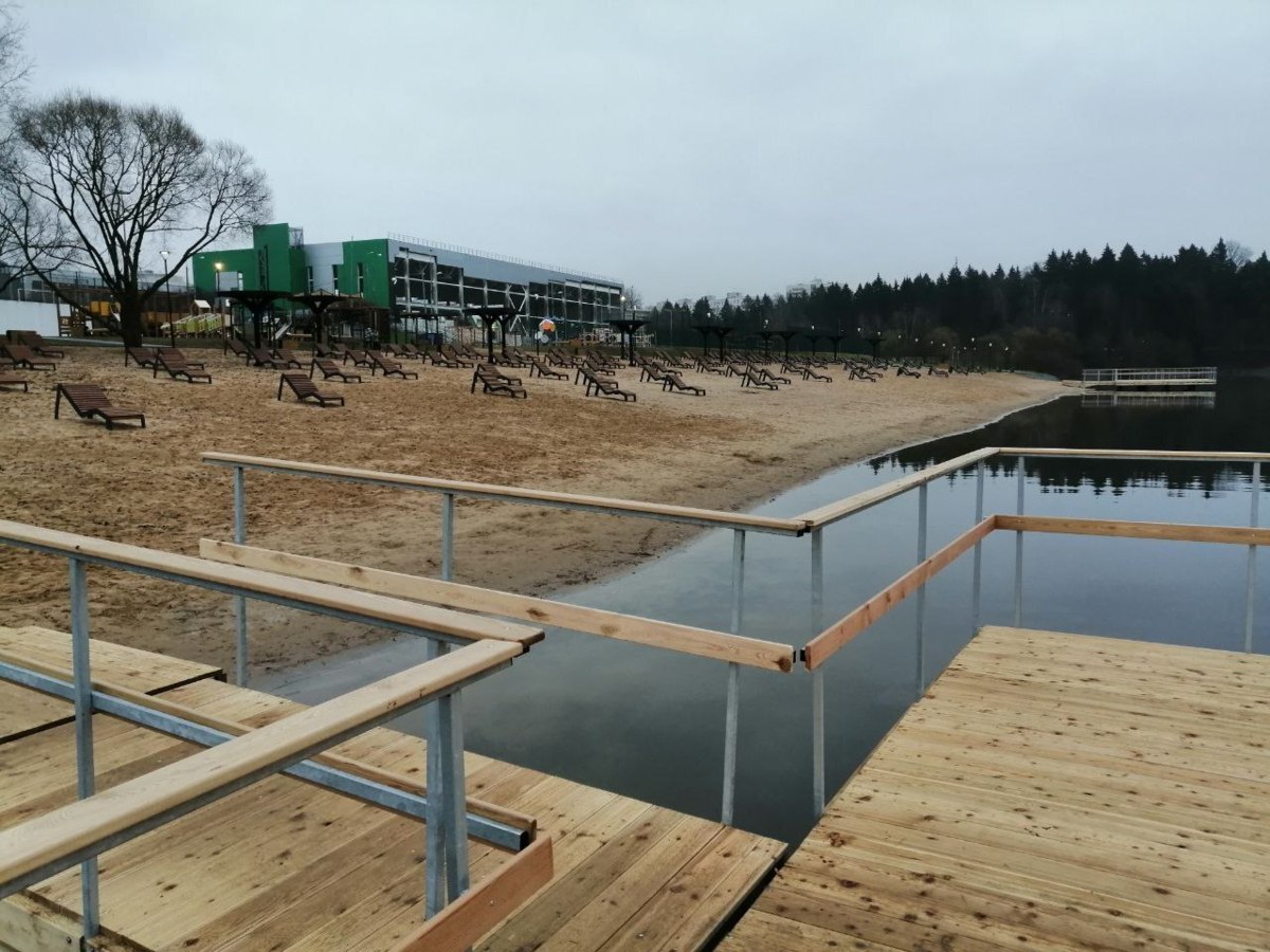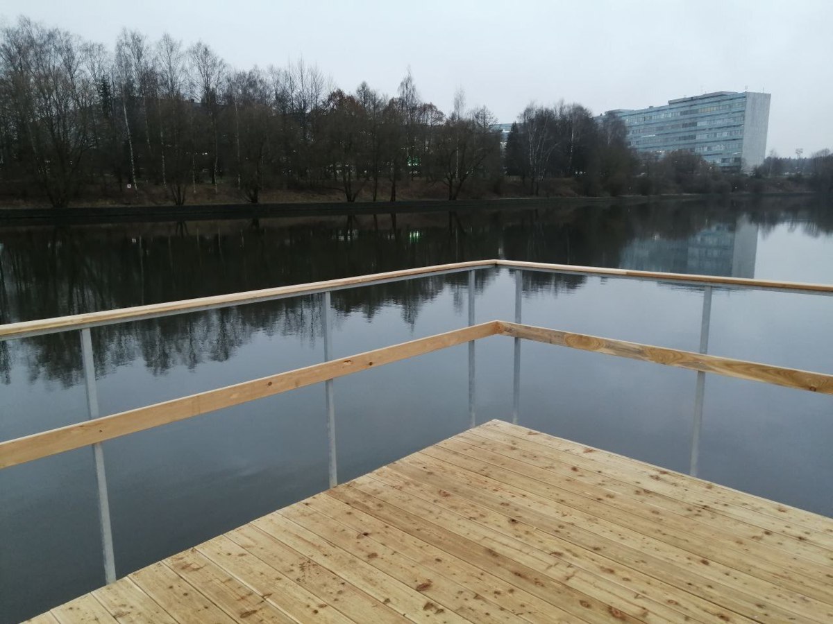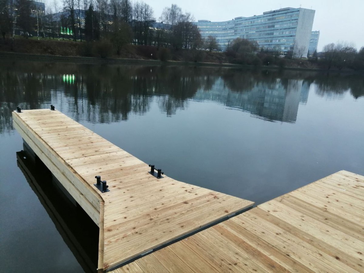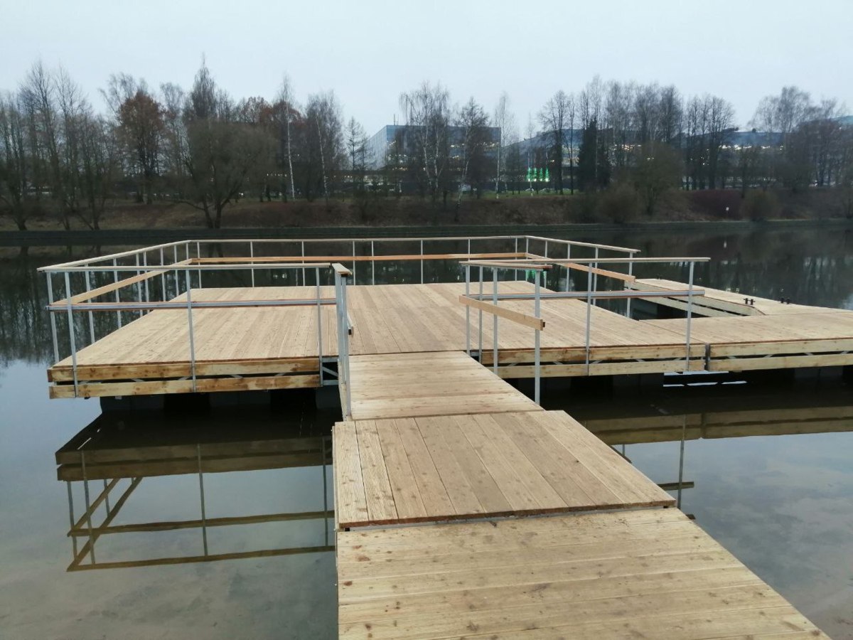 Второй на месте старого — перед спасательной вышкой, у него с входом всё нормально. Кроме основной площадки у него есть причал для лодок со скобами для швартовки.
