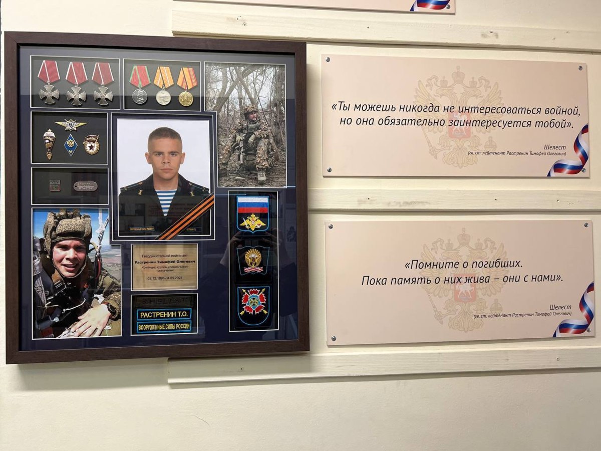 Она появилась в школе 1194 в 15-м микрорайоне в честь выпускника, Героя России Тимофея Растренина, погибшего в зоне специальной военной операции. Парту открыл отец Тимофея Олег Растренин и передал школе личную реликвию сына — парашют, который привозил с собой из зоны боевых действий.