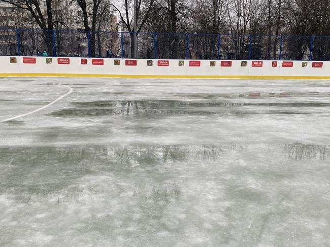 На темпы работ влияет и погода. Искусственный лёд промораживается снизу — через систему труб под катком, по которым циркулирует охлаждающий раствор. При сильном морозе сверху вода может схватываться быстрее, чем промерзает снизу: образуется тонкая «плёнка», а слои получаются неправильными.