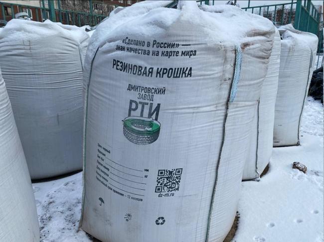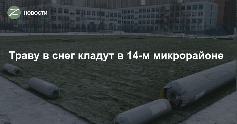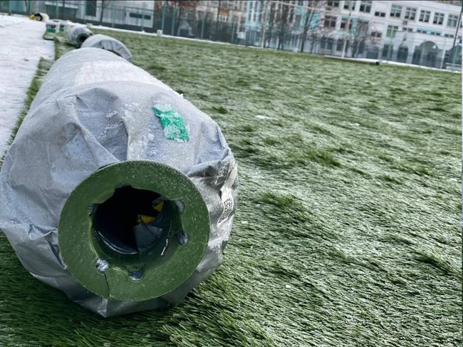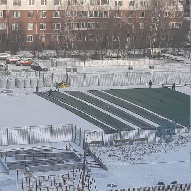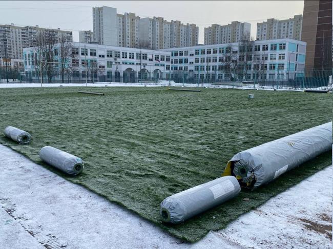 На регбийном стадионе у корпуса 1437 меняют покрытие — вчера рулоны с искусственной травой начали расстилать прямо поверх свежевыпавшего снега.