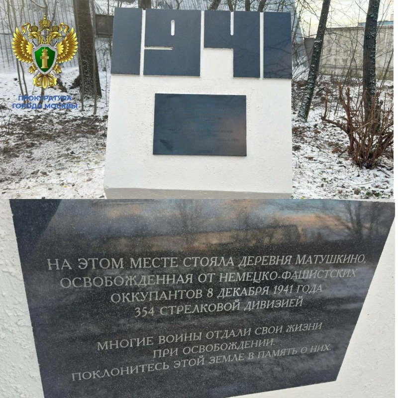 Памятный знак «Воинам 354-й стрелковой дивизии» на пересечении Панфиловского проспекта и Ленинградского шоссе привели в порядок после обращения жительницы Зеленограда на личном приёме у прокурора Москвы.