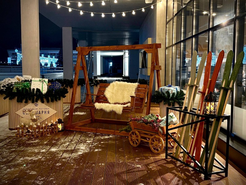 Она оформлена в загородном зимнем стиле: деревянные кресла и качели с меховыми накидками, декоративный очаг с дровами, лыжи и гирлянды тёплого света, еловые композиции и подарочные коробки. Пространство открытое, с панорамными окнами, подходит для дневных и вечерних фото.