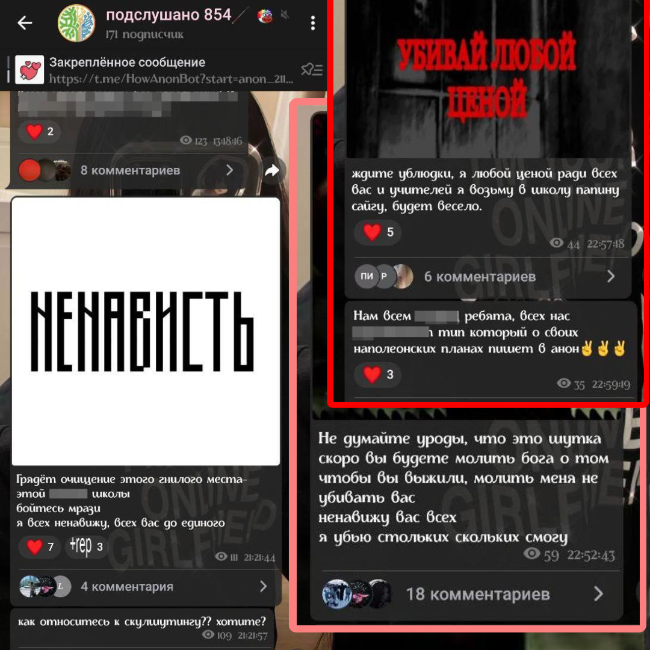 Несколько сообщений с угрозами в адрес учеников и учителей были опубликованы 10 января в телеграмм-канале «Подслушано 854» (172 подписчика). Скриншоты сообщений в редакцию «Зеленоград.ру» переслал родитель одного из учеников школы.