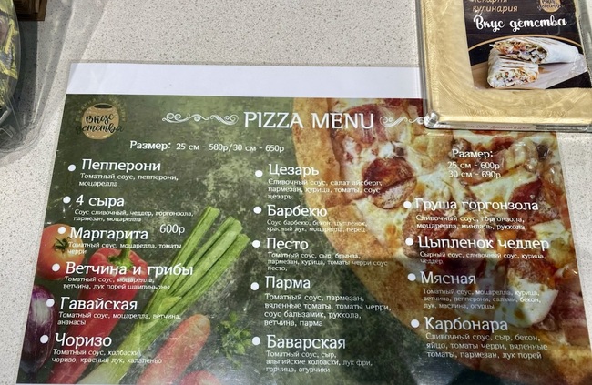 В меню представлены разные виды пиццы: «Пепперони», «Маргарита», «Гавайская», «Цезарь», «Груша горгонзолла» и другие. Стоимость — от 580 рублей за пиццу диаметром 25 см до 690 рублей за 30 см.