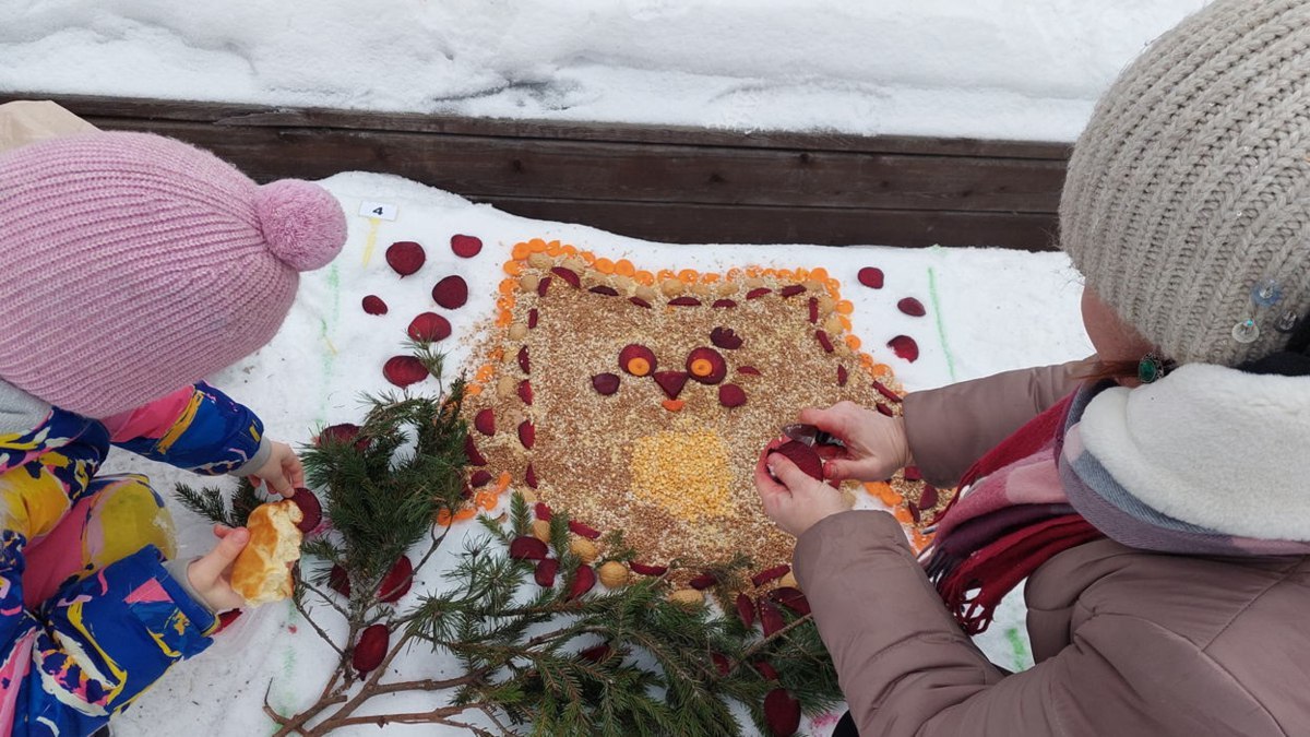 Дети и родители нарисуют на снегу картины из сушеных ягод, орехов, желудей, семечек и других природных материалов — потом они станут подкормкой для зимующих птиц и зверей