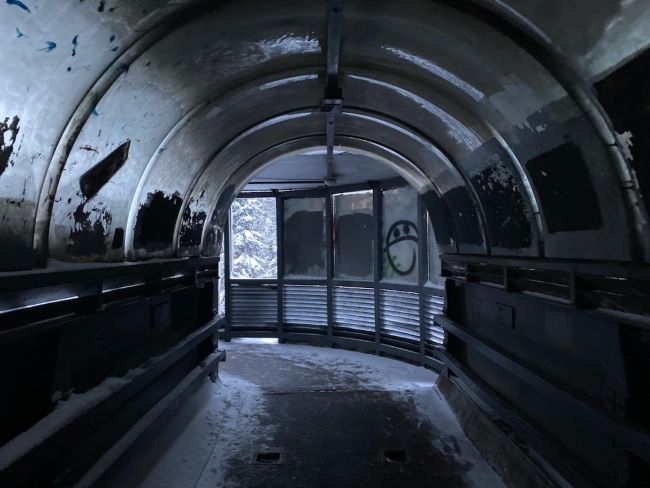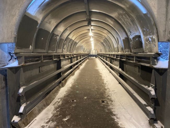 Сам переход сделан из полупрозрачных материалов, но выпавший сверху снег и тёмные боковые панели заметно ухудшают видимость даже днём. Есть и вопросы к состоянию сооружения: на лестницах местами отходят элементы крепления ступеней. Боковые панели также нуждаются в очистке — слои краски и налёта дополнительно «съедают» свет.