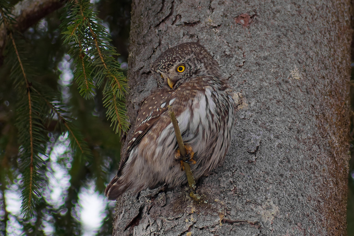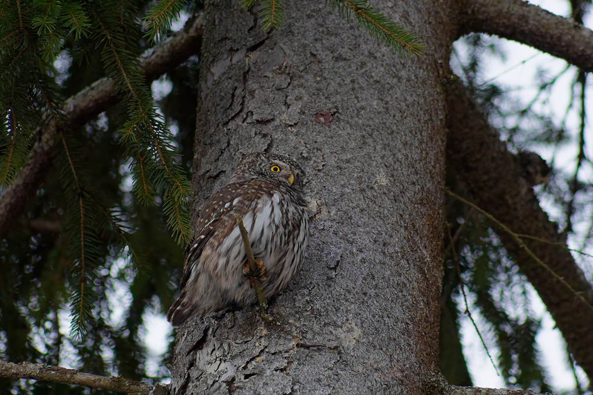 — Он часто сидит вертикально у ствола: это характерная поза воробьиного сыча — может подолгу сидеть у дупла или на ветке, почти не двигаясь и наблюдая за лесом. При этом голова у совы поворачивается очень резко — почти на 270 градусов.
