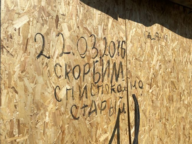 На деревянных панелях, которыми закрыт вход в сгоревший магазин, появилась надпись: «22.03.2026. Скорбим. Спи спокойно, старый». К чему именно она относится, не уточняется, но, вероятно, речь о самом павильоне.