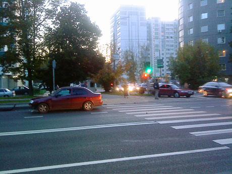 Очередное ДТП произошло вчера около восьми вечера на регулируемом перекрестке возле корпуса 250. Как рассказал Zelenograd.ru очевидец аварии Константин Антонович, «Тойота» поворачивала с Центрального проспекта во второй микрорайон, «Хенде Акцент» ехал прямо в правом ряду по направлению к площади Юности. Удар пришелся в правое заднее крыло. Машину закрутило, она чудом не задела пешеходов. После удара у «Хенде» под капотом появилось открытое пламя. Огонь сбили без пожарных, скинули клемму. Водители не пострадали. «„Привет“ глазеющим водятлам, проезжающим мимо и тыкающим пальцами», отметил очевидец.
