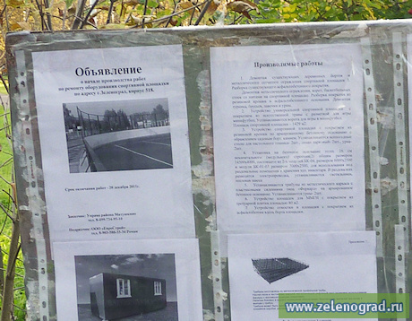 На технический надзор за капремонтом спортивных площадок выделено, согласно аукционной документации, 942 тысячи рублей. В требованиях к работам значатся следующие пункты: «Не позднее 1-х суток до даты открытия объекта обеспечить силами подрядной организации установку информационного щита на каждом объекте производства работ», «выставлять временные ограждения в производстве работ». Игронирование этих пунктов напомнило летнюю историю с программой благоустройства дворов и подъездов, когда прописанные в документах требования не выполнялись. В случае со спортплощадками технический надзор осуществляет ООО «Атлант». Заказчиком же работ выступает зеленоградская префектура («сокращенная» в объявлении до управы).