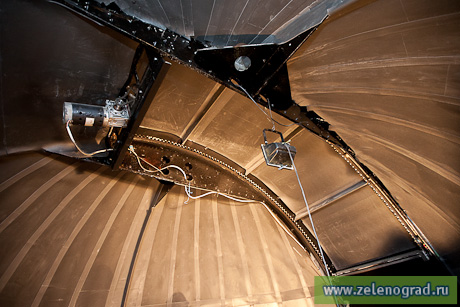 "Купол с внешним диаметром 4м с жестким алюминиевым каркасом и обшивкой алюминием, вращающийся от электропривода, с системой дистанционного управления, со створками, открывающими смотровое окно на требуемый просвет от 40 до 120 см. С системой вентиляции, техническим балконом по вокруг купола..."