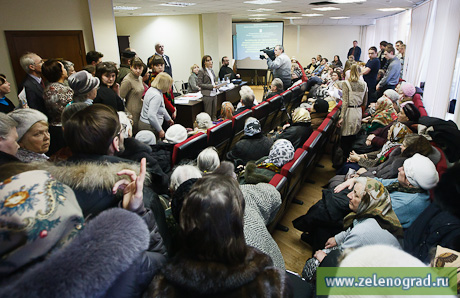 К пяти часам — за час до начала собрания — все кресла в зале были уже заняты. Судя по внешнему виду, разговорам между собой и дальнейшим высказываниям, большинство присутствующих в зале — прихожане зеленоградских храмов. Пришедшие выстроились в очередь за анкетами, в которых нужно было отметить свою позицию: «за» или «против» строительства храма. При этом в анкете нужно было указать, «являетесь ли вы жителем района Старое Крюково или работаете на предприятиях Южной промзоны» (территория которой относится к району строительства храма). Некоторые присутствующие спрашивали сотрудниц управы, раздающих анкеты, можно ли вписать туда несколько человек, на что получали утвердительный ответ.