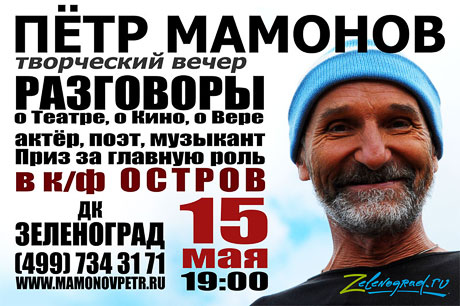 В прошлом году артист отметил свое 60-летие. Крупные телеканалы начали снимать документальные фильмы, в которых, по словам самого Петра Николаевича, показывали «не его, а кого-то другого». Тогда он решил взяться за дело сам, позвав на помощь режиссера Сергей Лобана, снявшего его в фильмах «Пыль» и «Шапито Шоу». То, что получилось, назвали «Мамон-Лобан». Зеленоградские зрители увидят фрагменты из этой и других картин с участием Петра Мамонова.