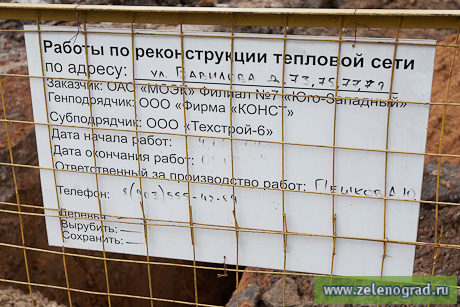 Корреспондент Zelenograd.ru побывал на месте строительных работ в 14:30. Забор к этому времени убрали, проезд был открыт. На установленном здесь информационном щите сообщается, что ведутся работы по реконструкции тепловой сети. Примечательно, что адрес работ прописан как «улица Вавилова» (каковой в Зеленограде не существует), а заказчиком реконструкции является филиал МОЭК Юго-Западного округа Москвы. Также отсутствуют даты начала и окончания работ; телефон ответственного за производство работ А.Ю. Пешкова написан от руки и полустерт.