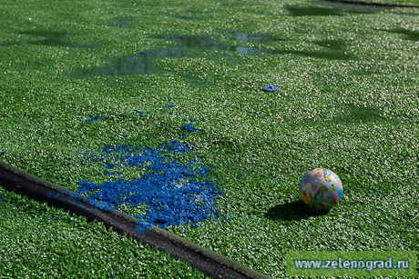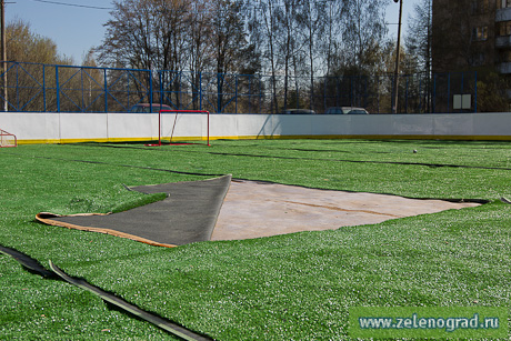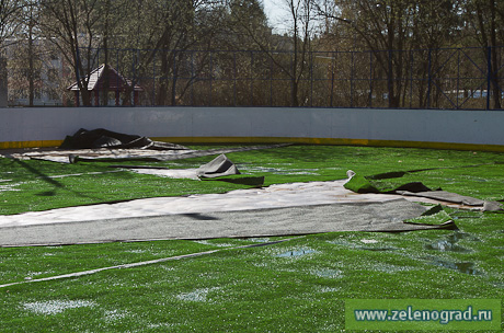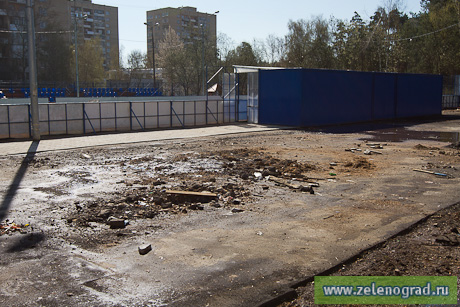 Из-за ранних заморозков осенью прошлого года заказчик работ — ГУ «Инженерная служба ЗелАО» (ГУ ИС) — предполагал, что ремонт части спортплощадок завершится весной, но сейчас работы так не возобновились. Между тем в прошлом году руководитель ГУ ИС Алексей Старцев заявил, что уверен в подрядчиках: «качественная проработка документации аукционов позволила выбрать подрядчиков, имеющих необходимый опыт, ресурсы, а главное — позитивную репутацию, в том числе и в Зеленограде». На информационном щите около ремонтируемой в прошлом году площадки в качестве подрядчика значилось ООО «Еврострой», печально известное в связи с работами по благоустройству дворовых территорий в прошлом году.