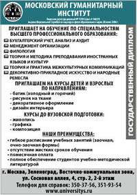 Кроме того, Учебный центр Московского гуманитарного института приглашает детей и взрослых на курсы по следующим направлениям: батик (холодный и горячий), рисунок на ткани, декоративное оформление, дизайн интерьера. А также на курсы довузовской подготовки по живописи, графике, композиции.
