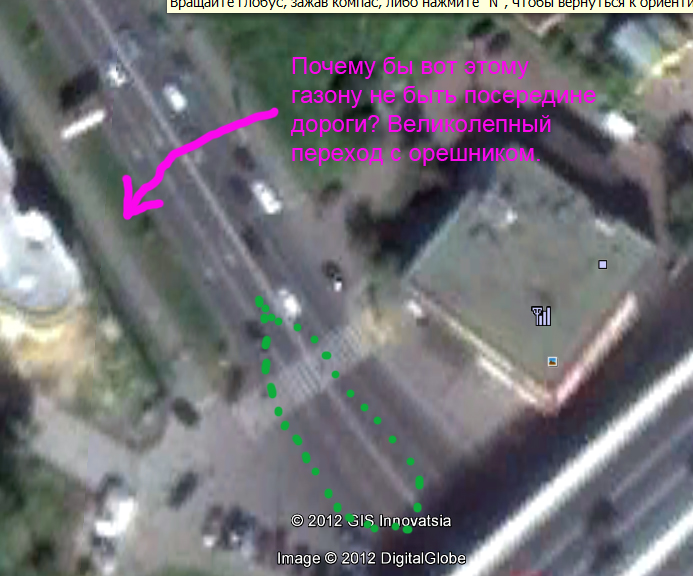 Люди ходят везде. Однако, всвязи с тем, что в данном случае они ходят через дорогу с интенсивным движением, следует свести к минимуму их потенциальный контакт с автомобилями. Так как подземный там не предвидится, следует либо ликвидировать нерегулируемый переход, либо сделать его регулируемым, но в последнем случае придется отказаться от перехода на пересечении с Советской ул.