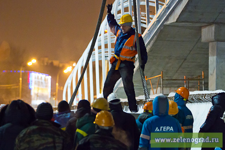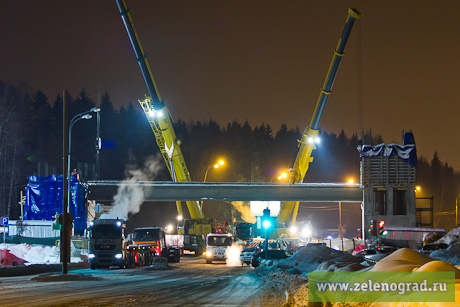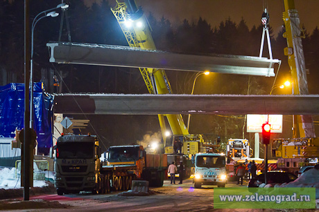 В ночь на воскресенье пролетную конструкцию успешно установили, монтаж занял около четырех часов. Большую часть времени велись подготовительные работы, сообщает корреспондент Zelenograd.ru — чистили снег, разворачивали подъемные краны и тягач с балкой. Движение по Солнечной аллее окончательно перекрыли в начале первого ночи. Сотрудники ГИБДД дежурили на месте с 22:30; здесь же находилось руководство фирмы «Гера», ведущей работы по реконструкции Солнечной аллеи. На этот раз на стройплощадке находилась «группа инженеров», рассказал Zelenograd.ru источник в окружной администрации, добавив, что при первой попытке монтажа присутствовал «один инженер и группа строителей».
