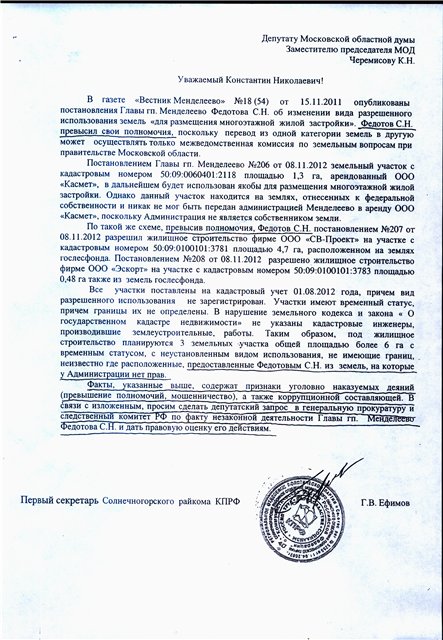 В Менделеево в данный момент образован Независимый гражданский совет (объединение инициативных жителей), который принял обращение в Совет депутатов и к главе поселения. «Мы считаем, что предлагаемая концепция развития городского поселения Менделеево нарушает право жителей на местное самоуправление и на благоприятную окружающую среду,- говорится в обращении, — закрепленные в законах „Об общих принципах организации местного самоуправления в Российской Федерации“ и „Об охране окружающей среды. Мы считаем недопустимым разрабатывать Генеральный план Менделеево на основе обнародованных администрацией Предложений по градостроительному развитию поселения“. В случае реализации в Генплане указанных „Предложений...“ предлагаем Совету депутатов г.п. Менделеево отказаться от утверждения и отправить его на доработку».