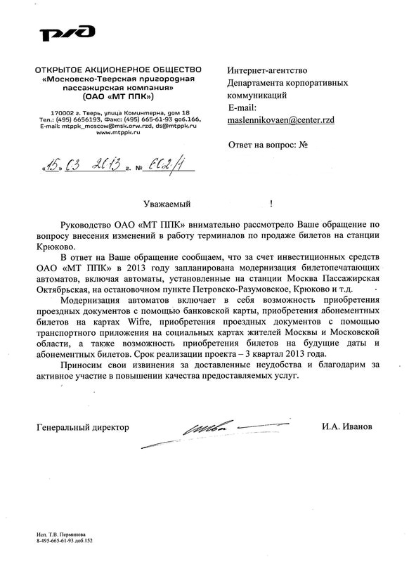 Ранее можно было связаться непосредственно с МТ ППК, занимающейся пригородными перевозками на участке Москва — Крюково, но в прошлом году году этот сервис отменили — ОАО «РЖД» перешло на централизованный учет и контроль жалоб пассажиров. В пригородной компании пассажиров просят сообщать о неисправных терминалах: чем больше будет такой информации, тем быстрее автоматы починят.