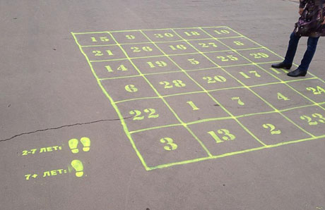 Расчерчены «многоклеточные классики», другой их вариант «три- пятнадцать-девять-двадцать» (или «ножки», также обозначена площадка для прыжков в длину с места. Площадки «предназначены для взрослых и детей, ожидающих автобус и желающих провести это время весело и с пользой», рассказали инициаторы их создания.