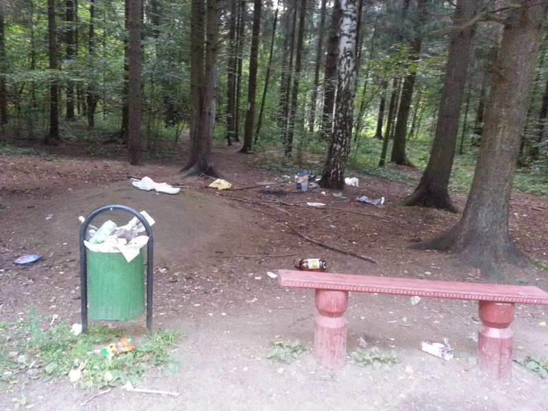 От лавочек остались только осиротелые урны- половина зеленого цвета, половина синего. Конечно же, мусор. И ШТЫРИ! продолжающие торчать уже без лавочек ( интересно, лавочки теперь на чье-то даче создают разнообразие?)