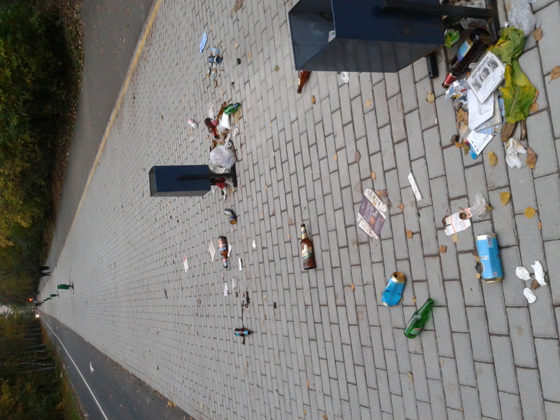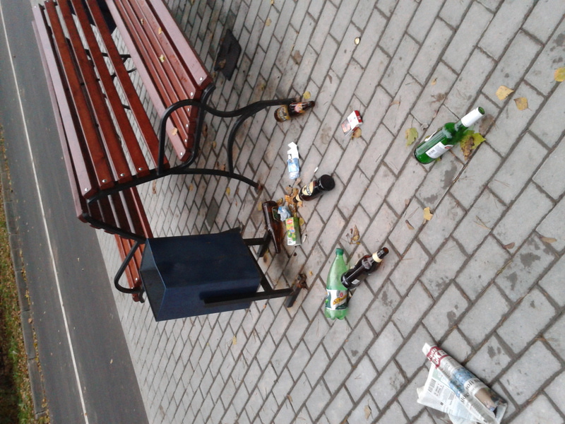 Лавочки до середины аллеи исчезли. Зато остался мусор о котором я и говорила ранее- разбитые бутылки из-под пива, водки, окурки, пустые пачки сигарет. Кто там кричал громче всех о том, что магазин далеко? Это никого не смутило. Покупают все через дорогу. Идти там 5 минут.